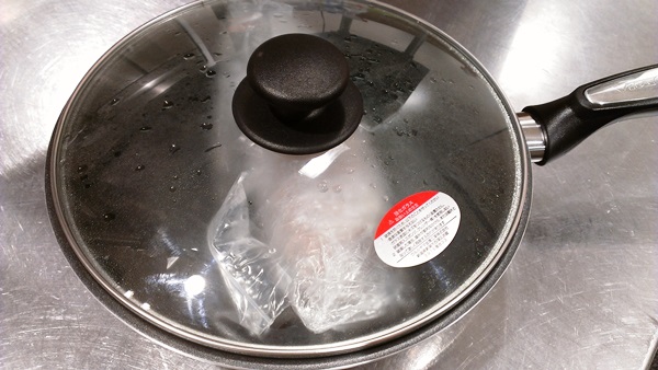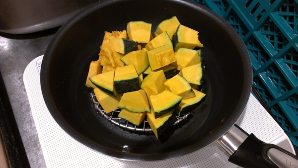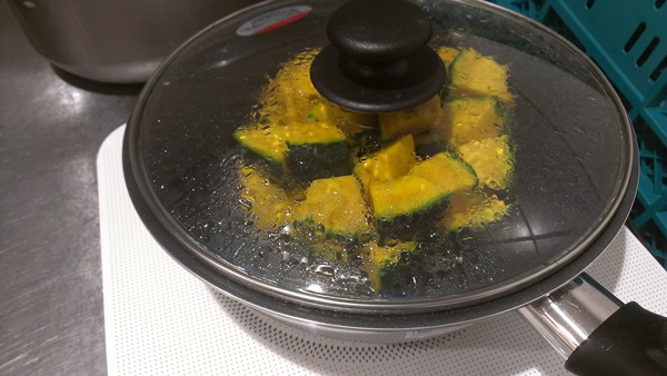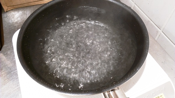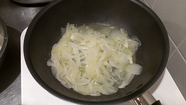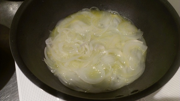 最初に水とオリーブオイルを一緒に入れてから加熱することで、水が沸騰してたまねぎがゆで上がります。