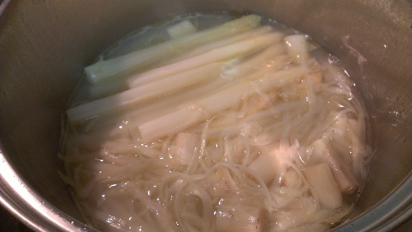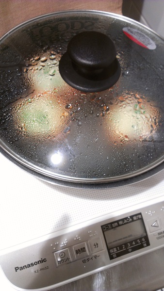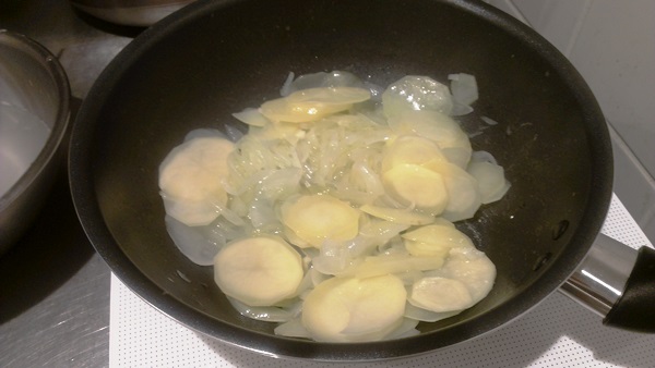 じゃがいものスライスとお水、昆布粉を、しっかり水が蒸発してオリーブオイルのみになったお鍋の中に入れ、じゃがいもに火が入るまで煮ていきます。