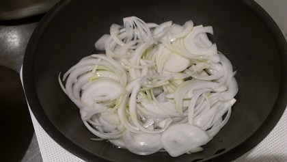 まず、鍋に玉ねぎの薄切りを入れます。と同時に、オリーブオイルと水を入れてから、強火で加熱。