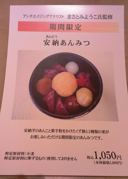 2013年11月から12月のまさとみ考案「安納あんみつ」@銀座立田野東急本店、大好評発売中です♪