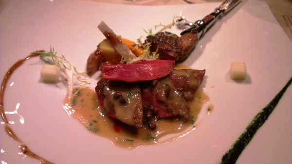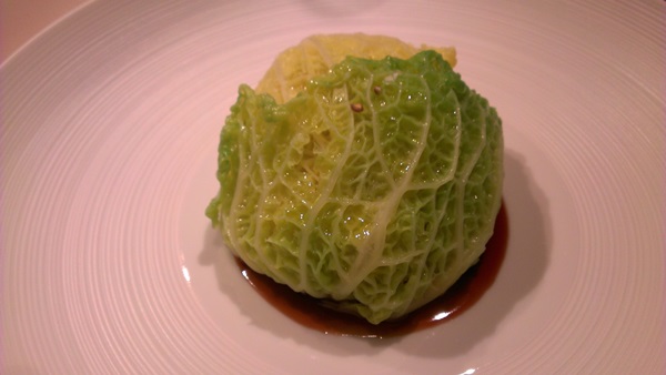 ちりめんキャベツのフォアグラ包み。トリュフソースとともに。