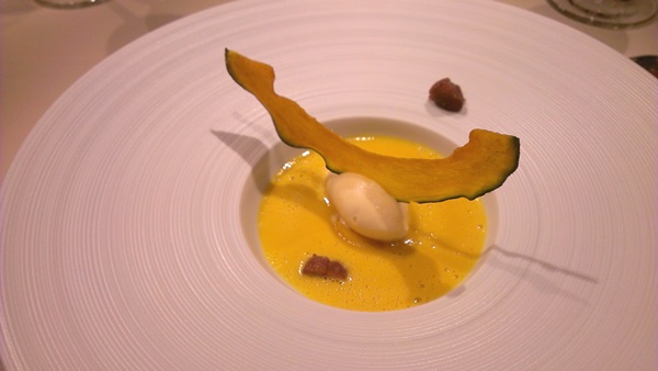 温かいかぼちゃスープと冷たいトリュフムースのコレボレーションがとっても美味☆
