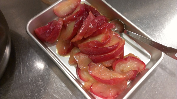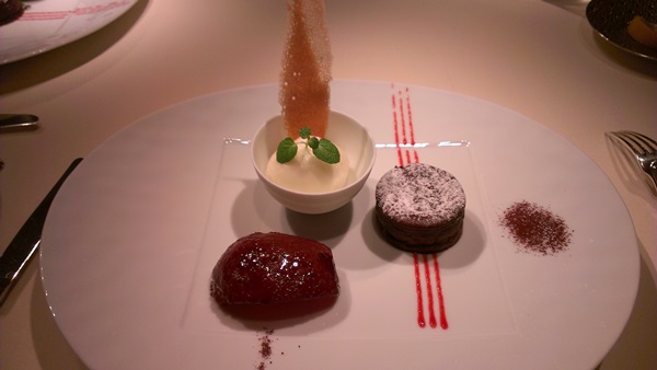 リンゴのシャーベット、洋ナシのコンポートをキャラメリゼに、温かいガトーショコラ。