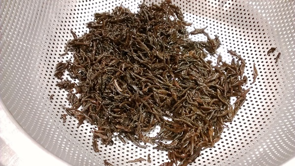 そして、今回の主役であるひじきさん。30分間水に浸して戻したら、ざるにあけます。