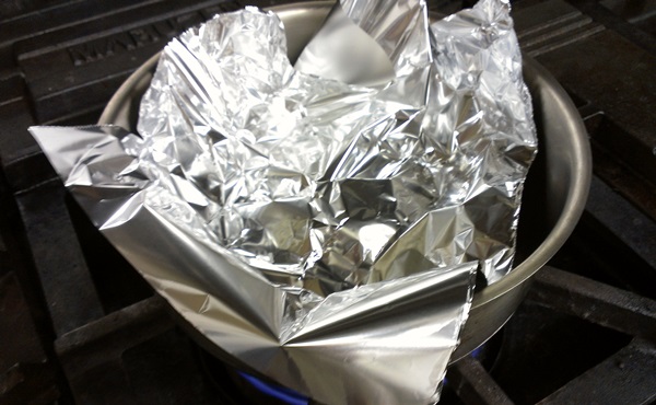 泥武士さんの厨房をお借りして、酒蒸し中です。アルミホイルをフタ代わりにしました。
